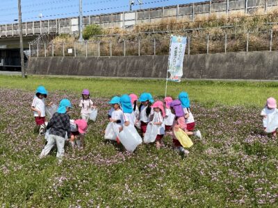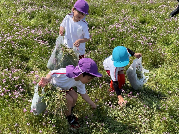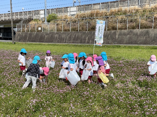 園児たちは、満開のれんげ畑の中、笑顔で袋いっぱいに花を摘み取り、みんな満足げな様子でした!