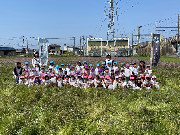 4月17日(木)、ふじのくに美農里(みのり)プロジェクトの活動組織「富士山のふもとの郷を守る会」(富士市神谷南)が管理する農地で、須津幼稚園の園児たち約50人が、楽しくれんげ摘みを行いました。