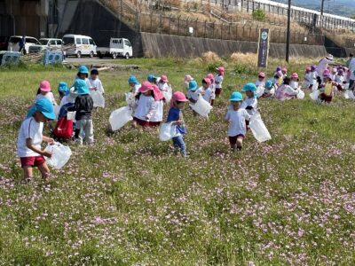 【富士市】須津幼稚園、ピンクの絨毯でお花摘み!