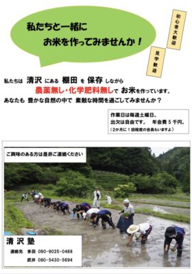 「清沢塾」は「清沢の棚田」を25年間守りながら、農薬・化学肥料を使わずにおコメを作っている市民団体です。