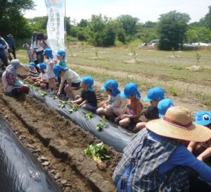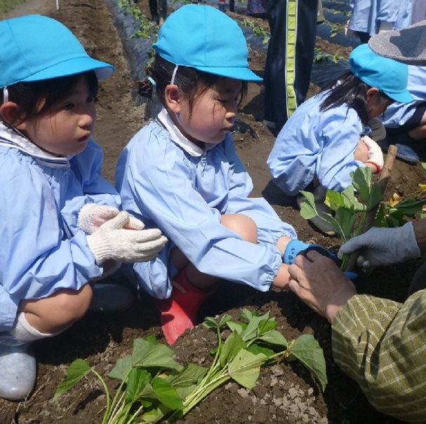 園児たちは、畝(うね)に一列に並び、会員の方にサツマイモの植え方を教えてもらいながら、楽しそうに定植を行っていました。