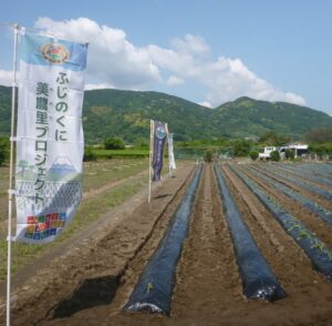 5月13日(火)、県が推進する「ふじのくに美農里(みのり)プロジェクト」に取り組む「岩本とかりがね堤を守る会」の協力のもと、岩本幼稚園・岩本保育園の園児34人と、就労継続支援B型事務所はみんぐの利用者5人が、サツマイモの定植を行いました。