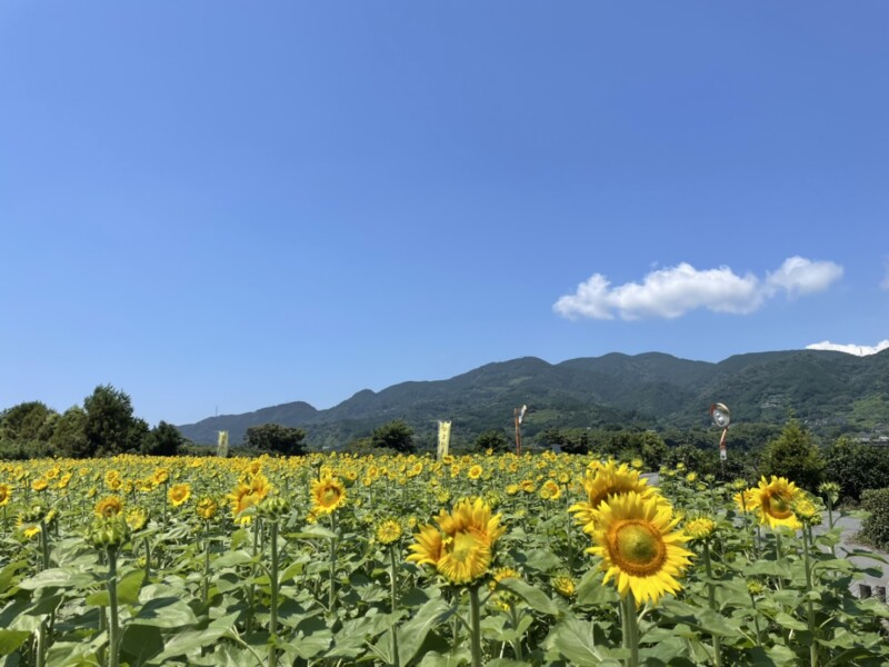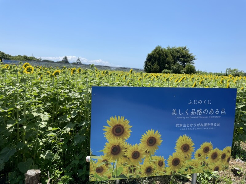 ※ミニストップ富士岩本店の交差点を西に入ると、左奥の方に黄色いのぼり旗のあるひまわり畑が見えてきます
