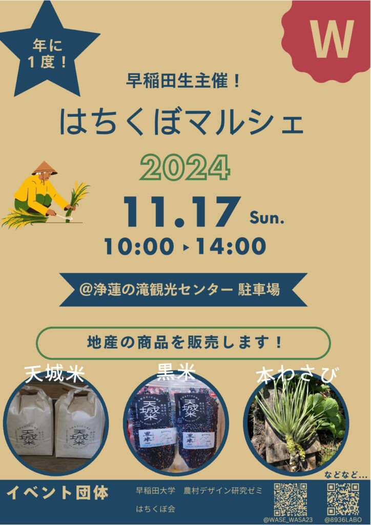 「はちくぼマルシェ2024農産物直売」は、今年で3回目。茅野地区で地域活性化や環境保全の活動を行う「はちくぼ会」と早稲田大学社会科学部落合教授ゼミが共同製作したオリジナルの軽トラ移動販売車「はちくぼ8936マルシェ」で、地元農産物や「わさびピクルス」「麦ストロー」といった商品販売などを行います!