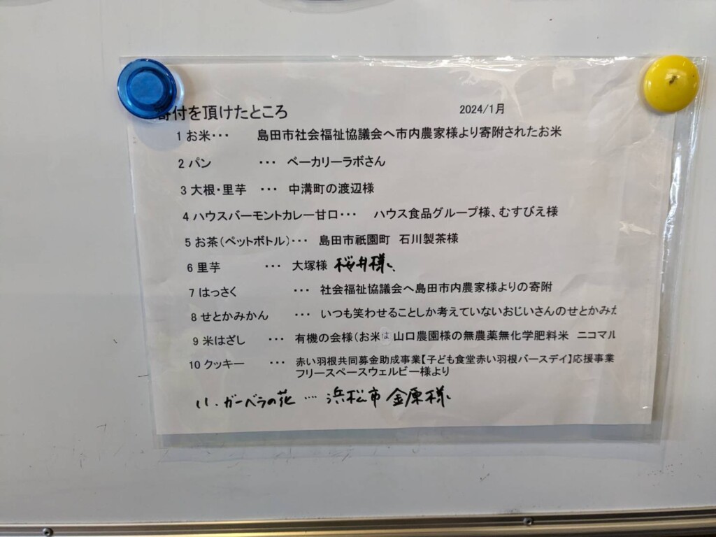 お昼に食材は、地域や知り合いなどかかわりのある方から様々な食材が提供され、子供たちのお昼ご飯として配られています。