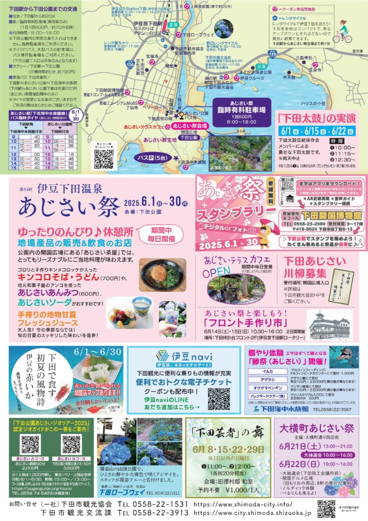 また、期間中は「下田あじさい川柳」の募集や、6月1日(日)・15日(日)・22日(日)には下田太鼓伝統保存会メンバーによる勇壮な「下田太鼓」の実演があります(①10:00〜②11:15〜③12:30〜(6/1は10時からのオープニングセレモニー終了後))。