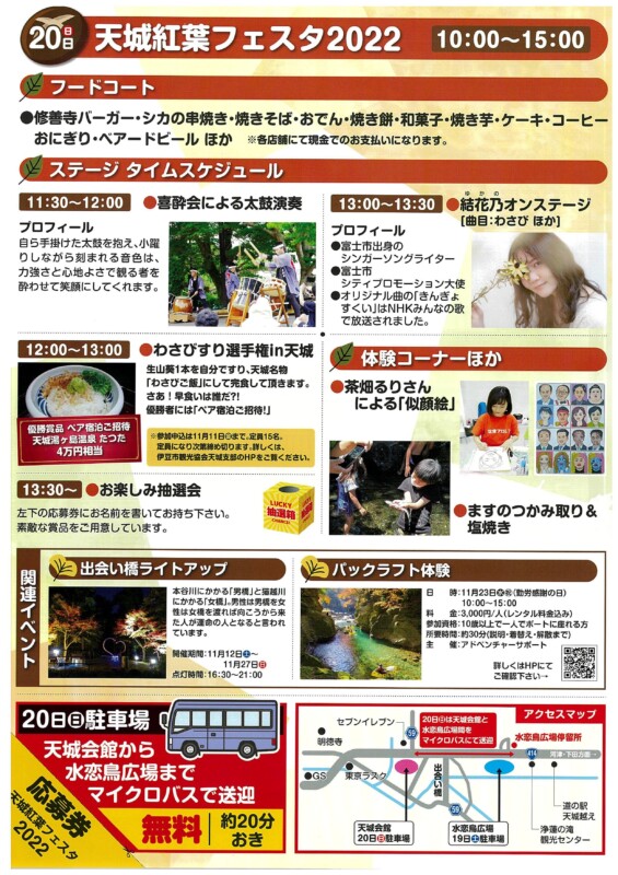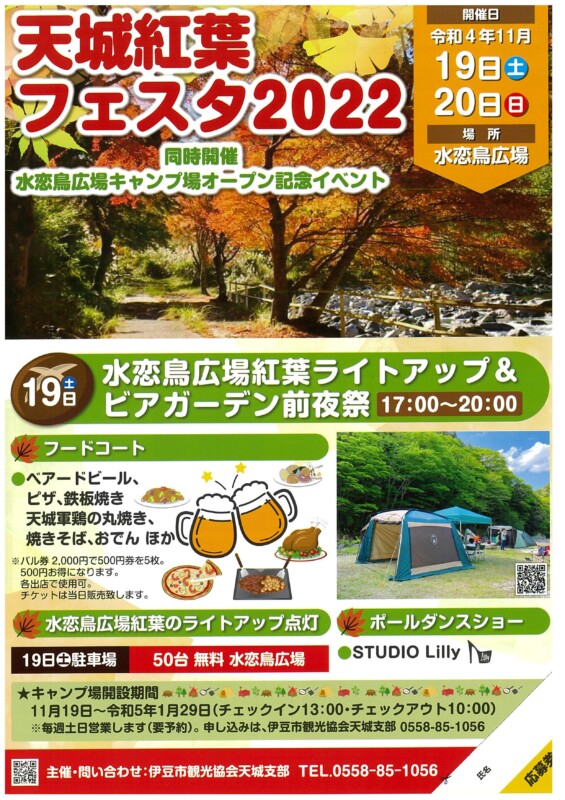 そして、11月19日・20日には、キャンプ場オープン記念に水恋鳥広場にて「天城(あまぎ)紅葉フェスタ2022」を開催します!!
