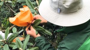 白びわの収穫は5月末~6月上旬ですが、その前にやっておきたい大切な作業があります。それが今回の「摘果・袋掛け」。袋掛け作業は、害鳥害虫、強風から実を守り、美味しくて見た目の良い白びわにするために大切な作業です。