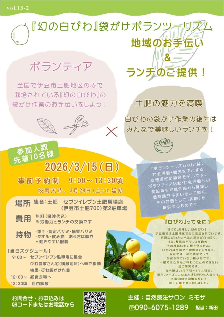 伊豆市の「自然療法サロンミモザ」では、全国で土肥(とい)地区にしかない希少な「白びわ」お手入れのボランティアと観光を融合させた「白びわボランツーリズム」を年3回開催しています。