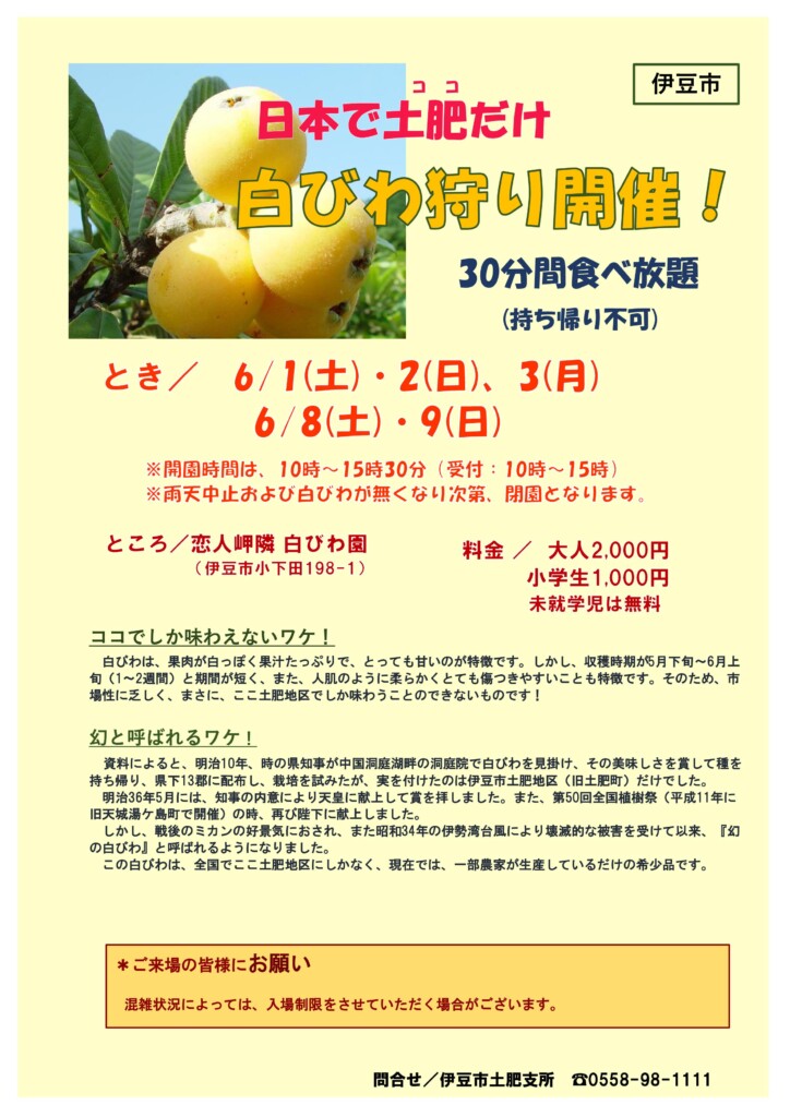土肥の白びわ園(恋人岬の隣り)で「白びわ狩り体験」(30分間食べ放題)が開催されますので、ぜひお越しください♪