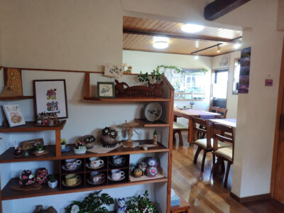 店内は木の温もりが感じられ、知人が制作した小物などが置かれ販売もしています。