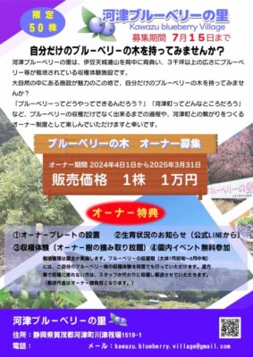 「ブルーベリーってどうやってできるんだろう?」「河津町ってどんなところだろう」など、ブルーベリーの収穫だけでなく出来るまでの過程や、河津町との繋がりをつくるオーナー制度として楽しんでいただけます!