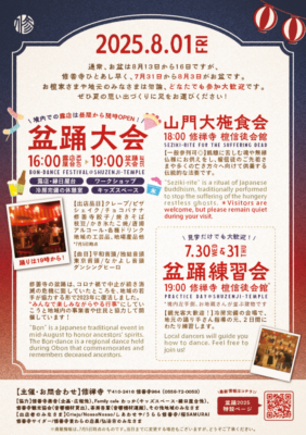 【日時】2025年8月1日(金) 16:00~露店・屋台オープン、18:00~山門大施食会、19:00~盆踊大会スタート