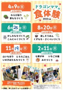 ドラゴンママでは、豊かな自然に包まれた北遠で、心のゆとりを感じながら季節の節目(五節句)を楽しむ体験イベントを通して、お子様から大人まで、より多くの皆様に季節の行事食や郷土料理のすばらしさをお伝えできたらと願っています。