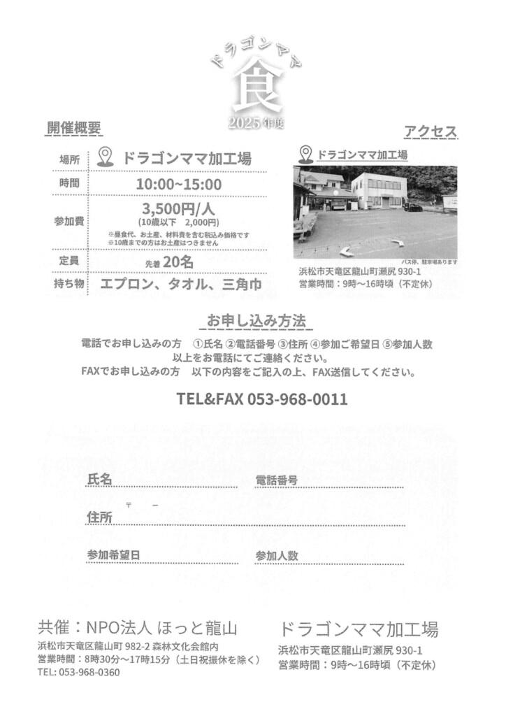 共催 NPO法人ほっと龍山 浜松市天竜区龍山町982-2森林文化会館内 営業時間8:30~17:15(土日祝振休除く)TEL053-968-0360