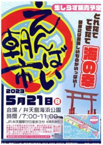 5月21日(日)弁天島海浜公園で、舞阪の海の幸、野菜、スイーツ、地元のお店屋さんなどが一斉に集うグルメイベント「えんばい朝市」が開催されます。