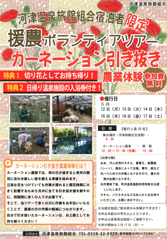 河津温泉旅館組合では、宿泊者限定の援農ボランティアツアー「カーネーション引き抜き農業体験」を開催します!