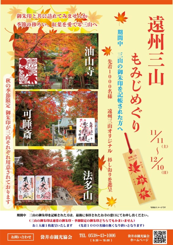 各寺境内の木々が赤や黄色に色づき、見頃を迎えています。秋の季節限定の御朱印が三山それぞれ用意されています。是非紅葉の見ごろを迎えている 油山寺、可睡斎、法多山にお出掛けされてみてはいかがでしょうか。
