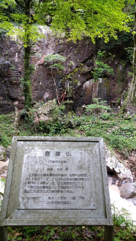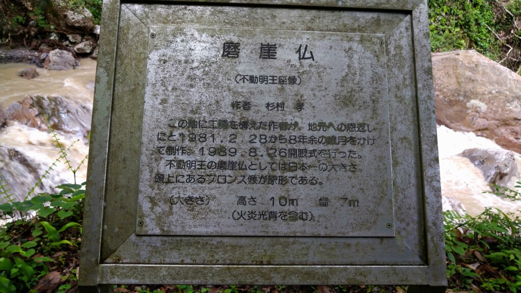 峡谷の岩肌には、この地に工房を構えた彫刻家・杉村孝氏が地元への恩返しとして8年の歳月をかけて制作した磨崖仏(不動明王像)が刻まれています。