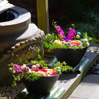 神社と人穴富士講遺跡の人穴浅間神社で花装飾も