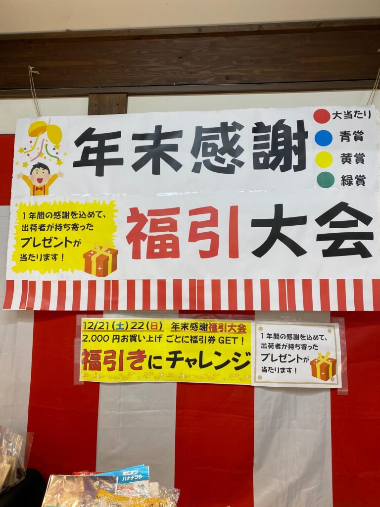 当日はレジにて2,000円お買い上げごとにくじ引き券をプレゼント。生産者が持ち寄ったプレゼントなど、空くじなしで必ず何かもらえます!
