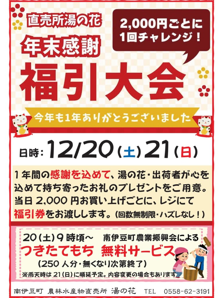 南伊豆湯の花では、年内最後のビッグイベント・年末感謝福引大会が開催されます。