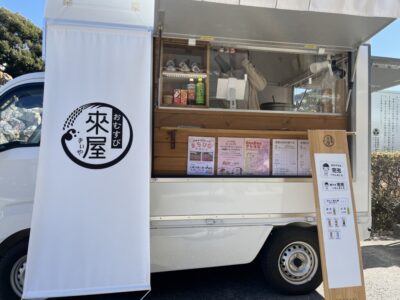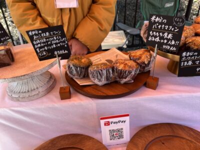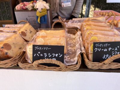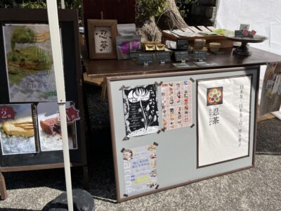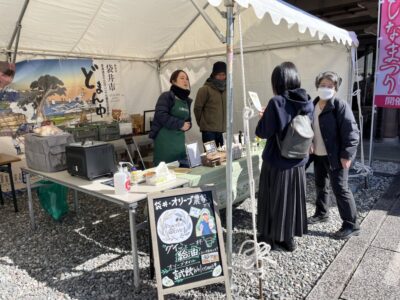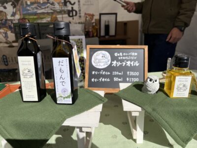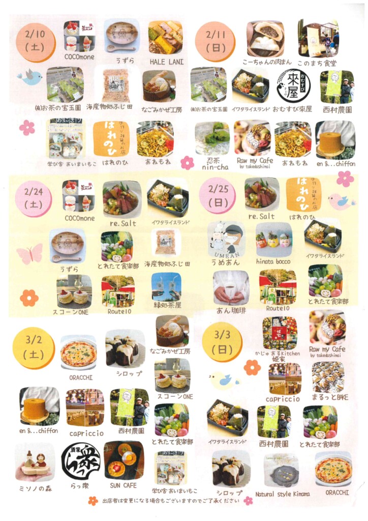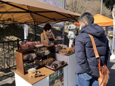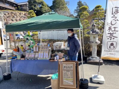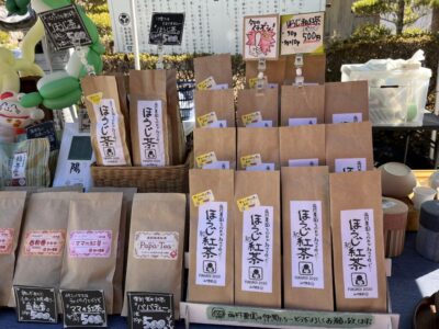 2月11日には、袋井市の西村農園が作った「ほうじ和紅茶」、耕作放棄茶園にオリーブを植えたオリーブ農園「Peaceful Olive」、イベント専門の葉茶屋「忍茶」の抹茶テリーヌなどのスイーツ、福田漁港の近くでおむすびを販売している「さい屋」、魔法のスーツ米粉を使った各種マフィン、自宅の前でしか販売しない自家製シフォンケーキ、その他手づくり肉まんなど地域の農産物などが出店していました。