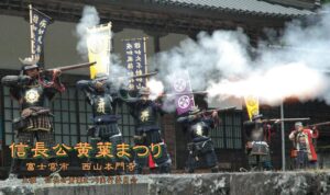 迫力ある勇壮な火縄銃の演武が見どころであり、