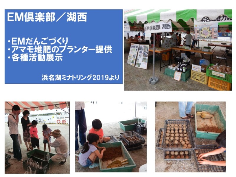EM倶楽部/湖西は、湖西市新居町でEM菌を活用して、ごみの減量化のために生ごみをEM菌でコンポスト化して団体が管理する市民農園の堆肥として活用しています。また、EM菌を練り込で「どろダンゴづくり」や米のとぎ汁を浜名川に投げ込むなど浜名湖の水質浄化活動も行っています。