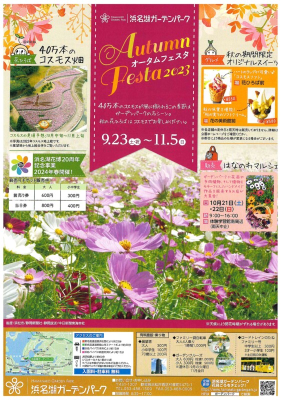 「浜名湖ガーデンパークオータムフェスタ2023」開催中です。40万本のコスモスが風に揺られるこの季節は、ガーデンパークの名シーン。コスモスは10月中旬から11月上旬が見頃になります。その他にも、はなのわマルシェやかぼちゃ重さ当てコンテスト、フラワーヘアー体験、ネイチャーヨガ、バードウォッチング、朝市マルシェなどなどイベントも盛りだくさん!