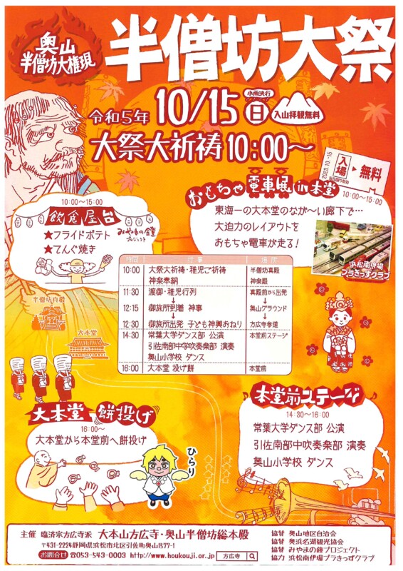 2023年10月15日(日)浜松市の方広寺(奥山半僧坊)で『大祭』が行なわれます。方広寺は、静岡県浜松市北区引佐町奥山にある臨済宗方広寺派の大本山。地元では奥山半僧坊と通称されています。これは明治14年の山林大火の際に類焼に遭うも方広寺の鎮守(奥山半僧坊大権現)である半僧坊真殿が焼け残ったことから、半僧坊信仰が全国に広がりました。大祭当日は、方広寺・奥山半僧坊境内での大祭大祈祷、神楽奉納、稚児ご祈祷、渡御・稚児行列、神事・放生会、投げ餅などが行なわれます。本堂前のステージでは常葉大学ダンス部公演や引佐南部中吹奏楽部による演奏、奥山小学校ダンスなど行われます。また、「飲食屋台」の出店や「おもちゃ電車展in本堂」では長い廊下に大迫力のレイアウトをおもちゃ電車が走ります。ぜひ皆さまお越しください!