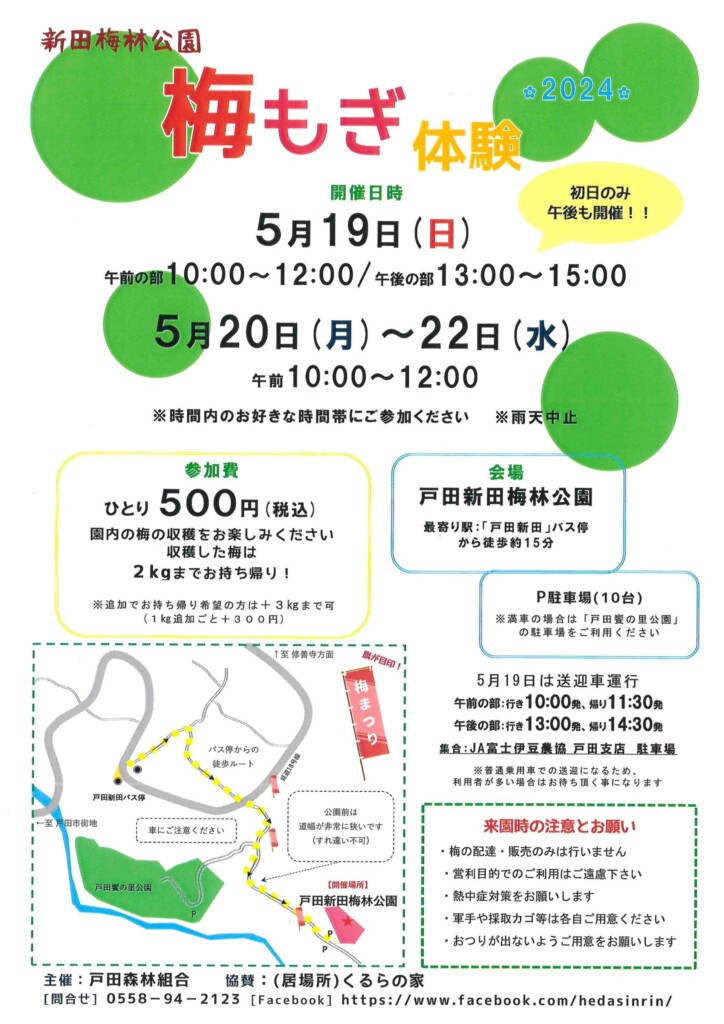 5/19(日)は、JA富士伊豆農協 戸田支店より送迎もあります(10:00/13:00)。
