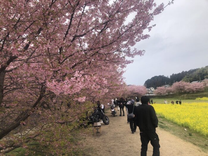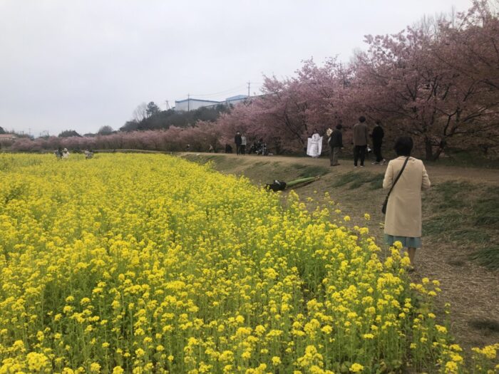 西部地域としての河津桜としては最大級の規模です。また、桜並木道沿いには、約2,000坪の菜の花畑も広がっており、ピンクと黄色のコントランスがとても鮮やかで楽しめます。