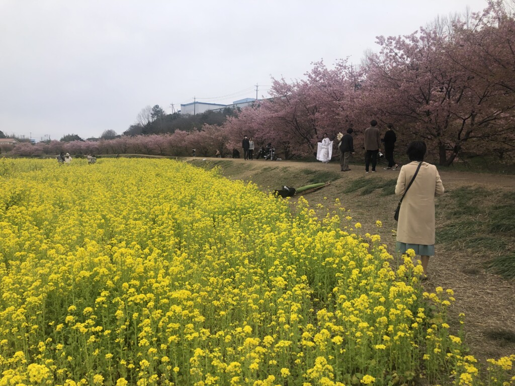 西部地域としての河津桜としては最大級の規模です。また、桜並木道沿いには、約2,000坪の菜の花畑も広がっており、ピンクと黄色のコントランスがとても鮮やかで楽しめます。