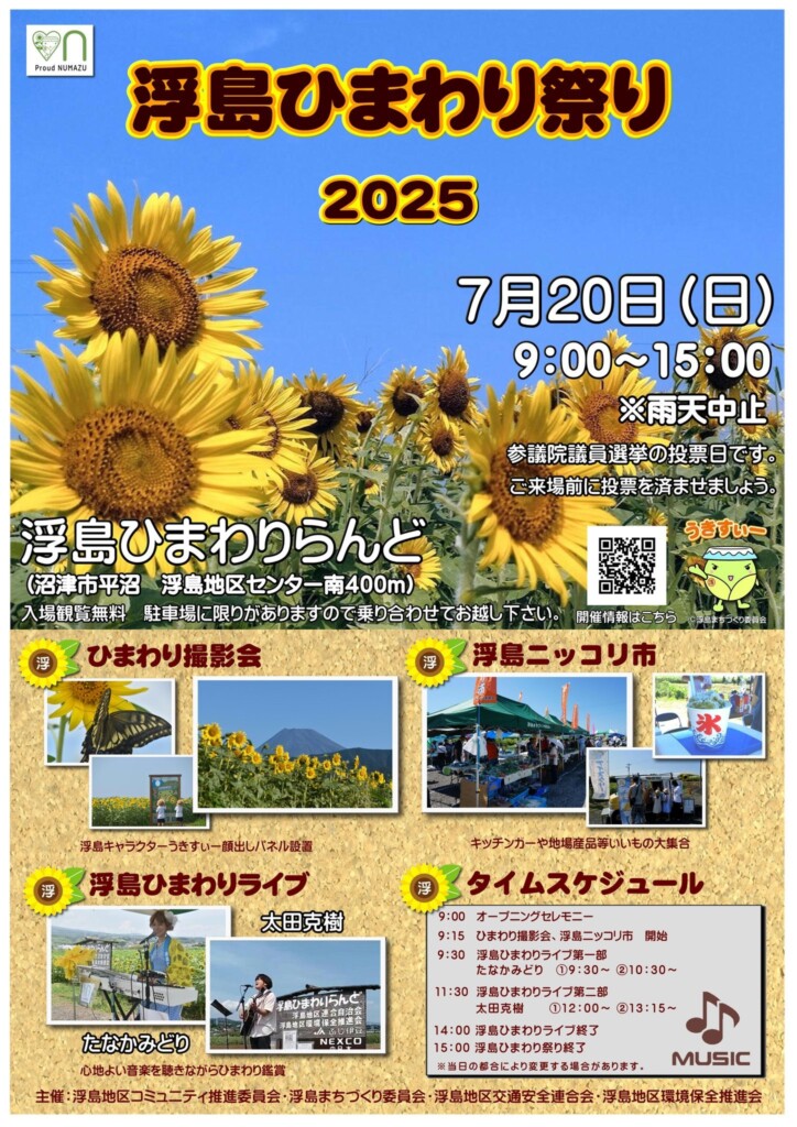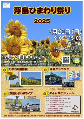 7/20(日)開催の「浮島ひまわり祭り2025」では、ヒマワリ満開の中で出店や音楽ライブをお楽しみいただけます。