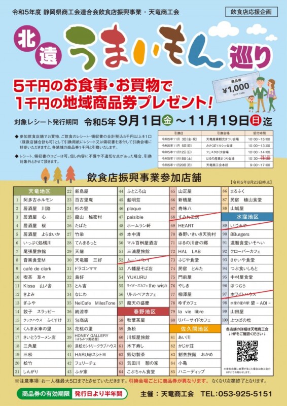 本日より(9/1)浜松市天竜区が区内の90店舗余りを対象にお得なキャンペーン「北遠うまいもん巡り」が始まります。新型コロナウィルスで客足が鈍った飲食店を応援するキャンペーンです。