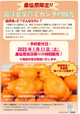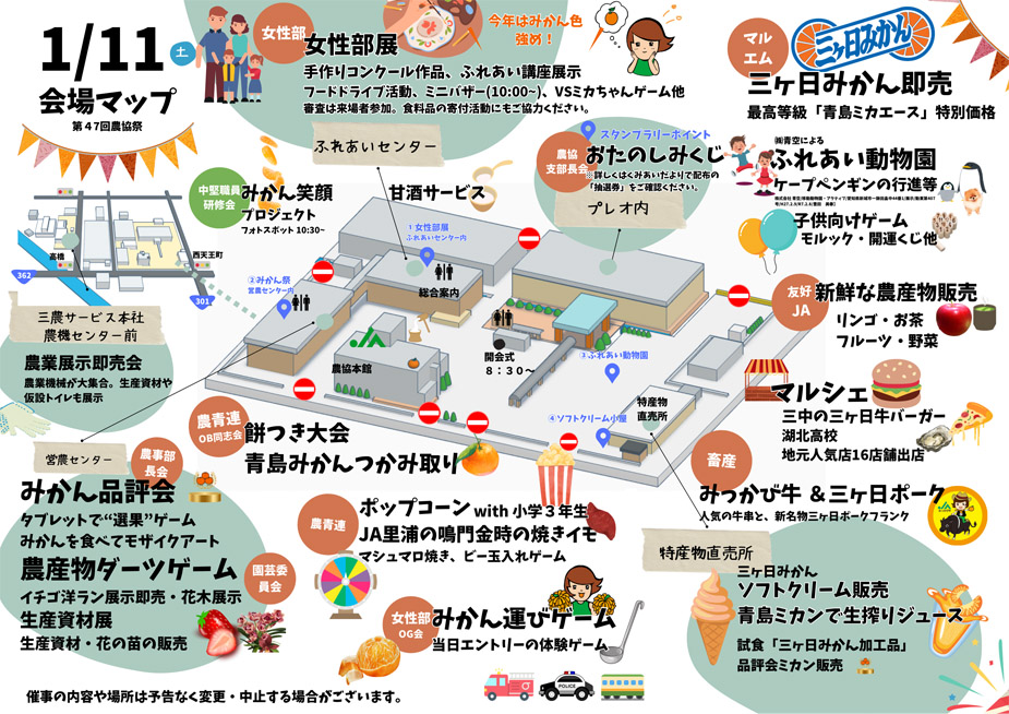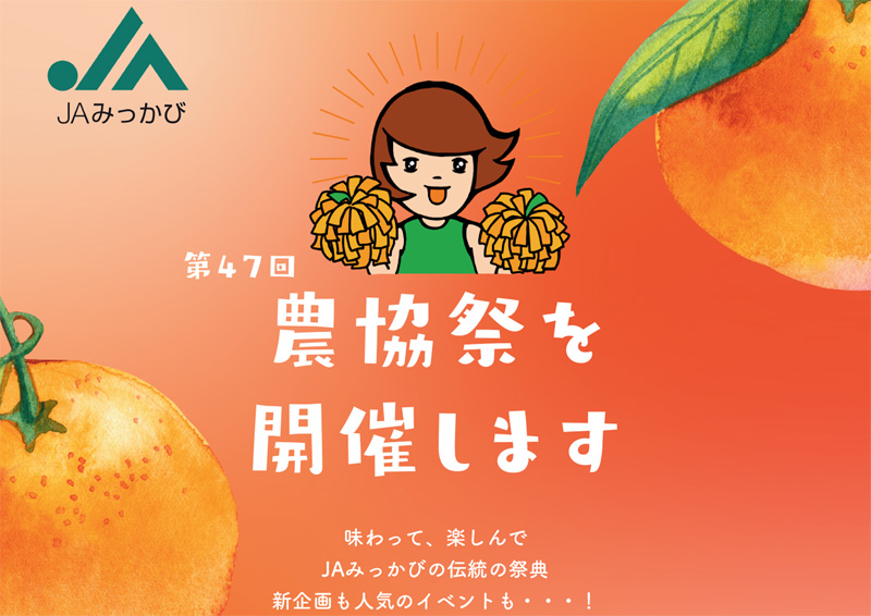 三ヶ日町農協の第47回の農協祭を開催します。三ヶ日みかんや、みっかび牛、三ヶ日牛バーガー、みかん品評会、新鮮な農産物販売、青島ミカンのつかみ取り、農産物の当たるダーツや、餅つき、青島ミカンの生絞りジュースなど!嬉しい美味しいことが盛りだくさん!!また、農協祭限定!!品評会受賞みかん予約販売も行います。数量限定!先着順でなくなり次第終了となります。(チラシをご覧ください)是非この機会にJAみっかび農協祭にお越しください。