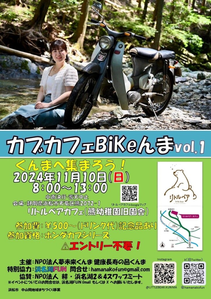 浜松市天竜区熊(くんま)のリトルベア・カフェで、くんま初のカブ・ミーティングが開催されます!ホンダのスーパーカブ愛好家の方たちに集まって頂き、広い園庭と園舎(カフェ)で、ゆっくりのんびり楽しみながら過ごして頂くイベントです。皆さんの参加をお待ちしています!