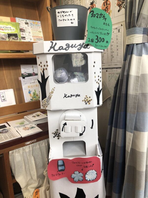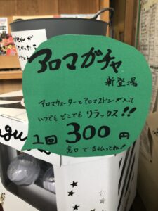 こんにちは!むらサポ サポーターです。今回、天竜区観光協会さんで、ガチャガチャを見つけました♪ ガチャの中身は「kaguya」さんのアロマウォータとアロマストーンのセットが入っています。こちらのアロマウォータは天竜区でとれた植物で作られています。どんなアロマウオーターとストーンが出るかはワクワク♪お楽しみに!