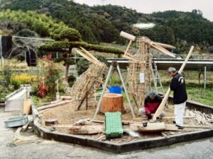 11月中旬から3週間ほどかけて完成させたオブジェは、高さは2.7mで木と竹で骨組みを作り、わらで覆ったもの。