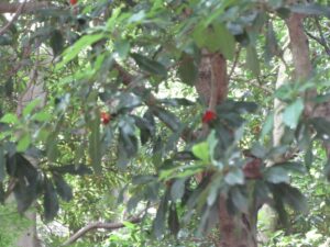 ヤマモモの実は足元にたくさん落ちて通路を赤く彩