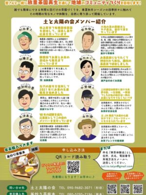 土と太陽の会 – プロジェクトは、牧之原市内の耕作放棄茶園を無農薬・無肥料の自然栽培で再生させ、皆様と一緒に作る茶畑として、誰でも簡単な茶園管理と寒茶作りから、子供達が当たり前に飲むようになる事で、放棄茶園問題の解決の一助にと活動してます。