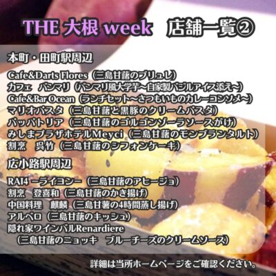 イベント期間内、week参加飲食店が三島甘藷(さつまいも)を使用した料理を提供します。
