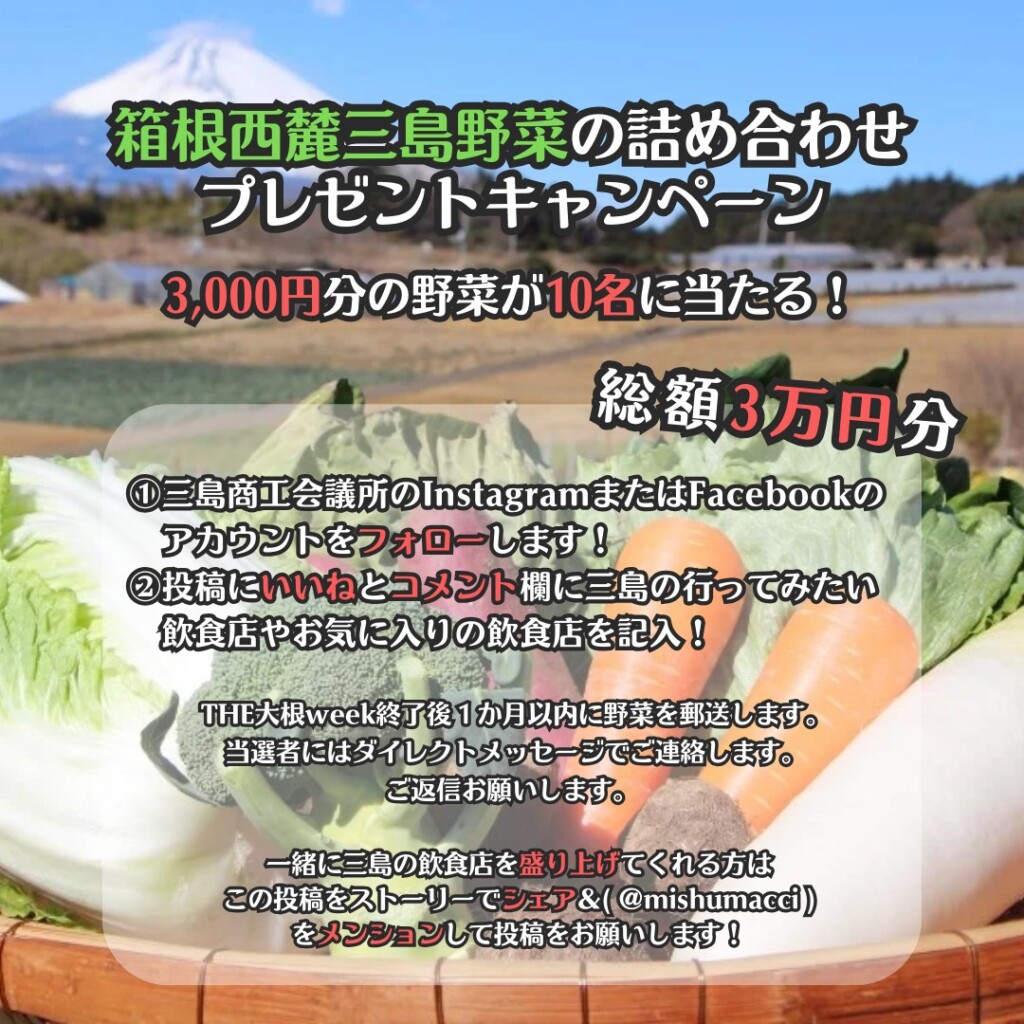 3,000円相当の箱根西麓三島野菜の詰め合わせが10名様に当たります。