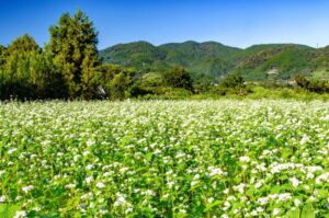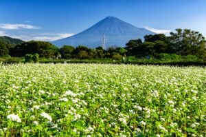 現在、富士市西部の雁堤と岩本山にある3か所のそば畑が見頃を迎えており、天気が良い時には富士山をバックに咲き誇る白い花を楽しむことができます(撮影:9月29日)。いずれの畑も農地の保全活動などを行う「岩本山とかりがね堤を守る会」の手によるもので、夏季はひまわり畑として人気を集めています。