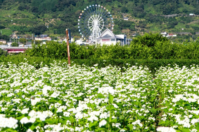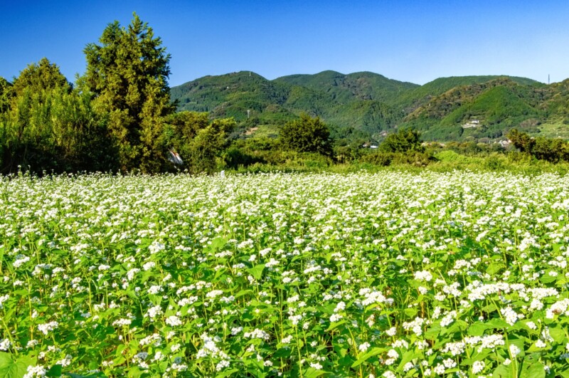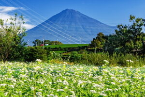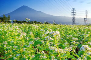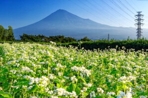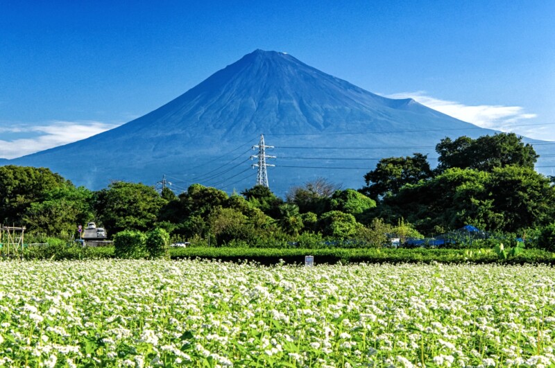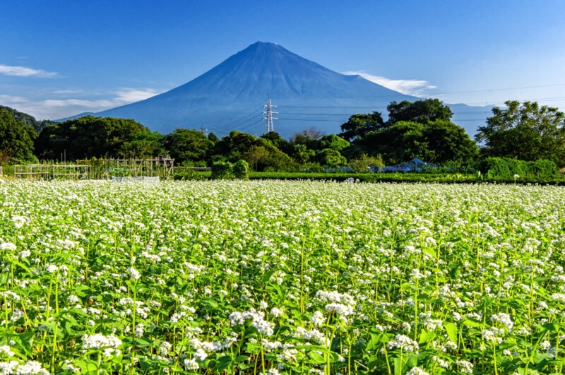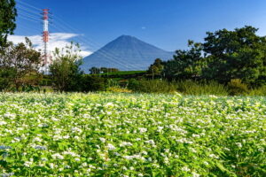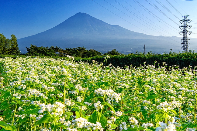 現在、富士市西部の雁堤と岩本山にある3か所のそば畑が見頃を迎えており、天気が良い時には富士山をバックに咲き誇る白い花を楽しむことができます(撮影:9月29日)。いずれの畑も農地の保全活動などを行う「岩本山とかりがね堤を守る会」の手によるもので、夏季はひまわり畑として人気を集めています。