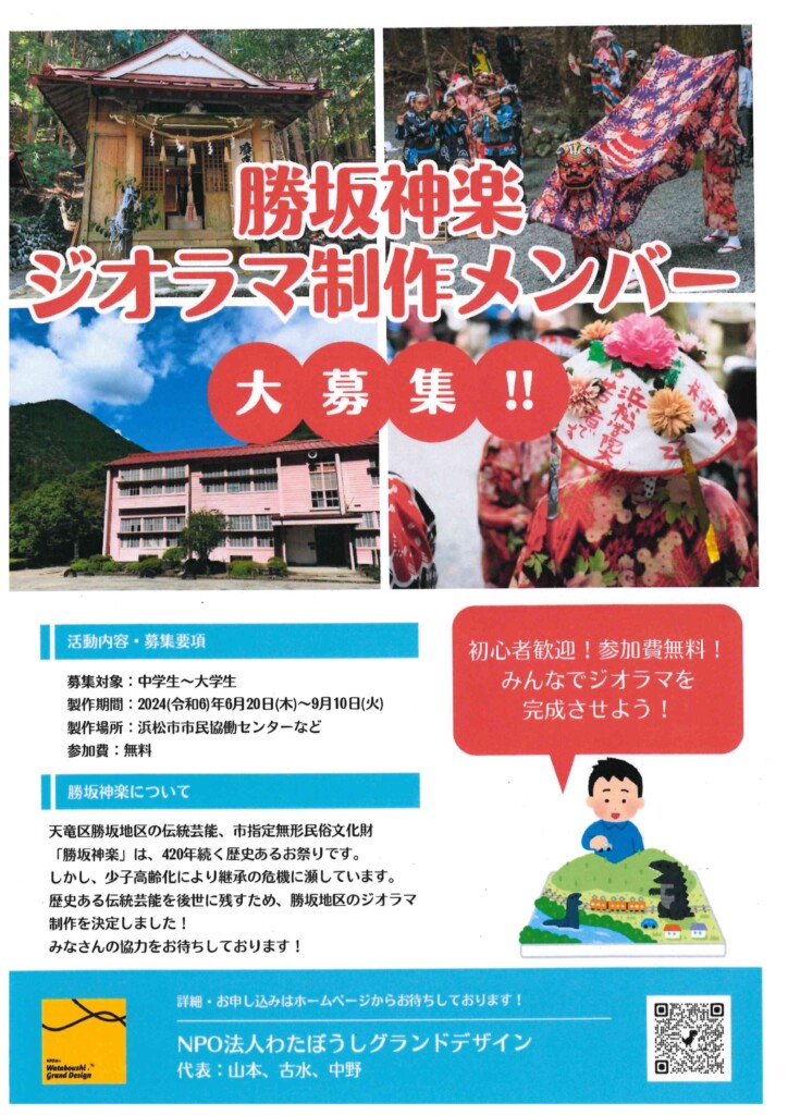 天竜区勝坂地区の伝統芸能、市指定無形民俗文化財「勝坂神楽」は、420年続く歴史あるお祭りです。しかし、少子高齢化により継承の危機に瀕しています。歴史ある伝統芸能を後世に残すため、勝坂地区のジオラマ作成をしています。みなさんの協力をお待ちしております!