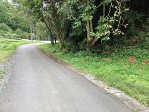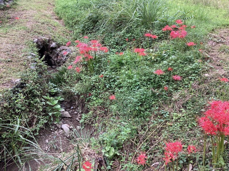 鍾乳洞の前には車が5台ぐらい停められるようになっています。私が行った先週末は(9/23)鍾乳洞前の道沿いにきれいな彼岸花が咲いていました。