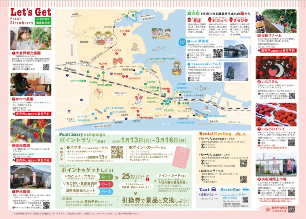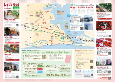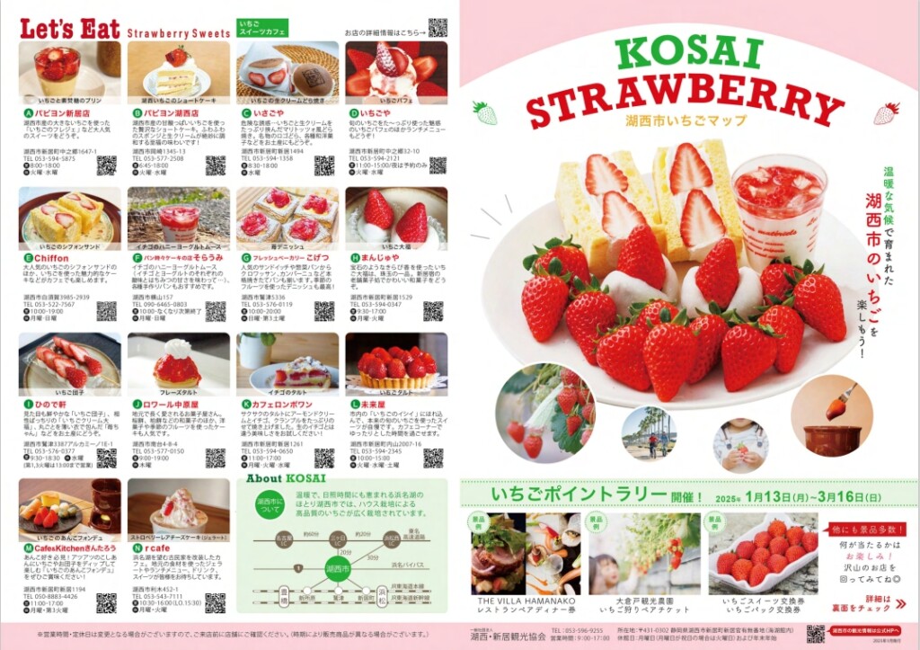 湖西市のいちごMAPが、今年もできました。MAPにはいちごスイーツを取り扱っているカフェ情報やいちご農家直売所、湖西市で生産される静岡県生まれのいちごの紹介など、いちご尽くしです。ポイントラリーも1月13日より開催されます。ポイントをゲットして景品と交換しましょう!