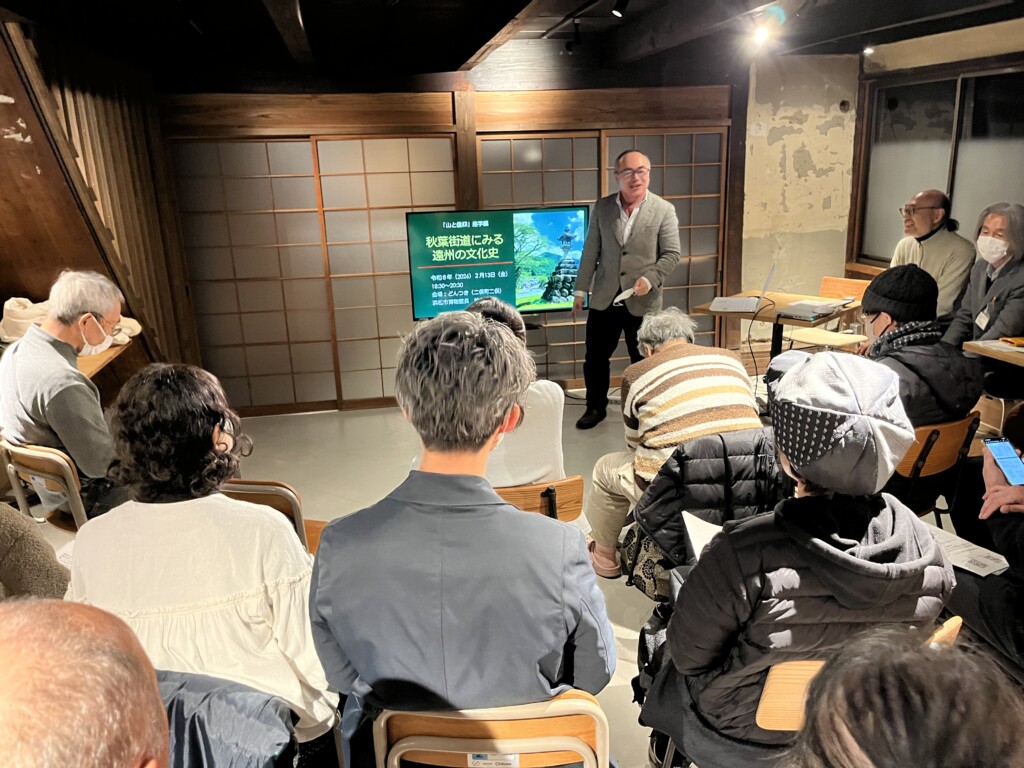 次いで、浜松市博物館の鈴木一有館長から「秋は古道にみる遠州の文化史」と題して講演がありました。秋葉信仰の歴史、秋葉街道の魅力、課題について説明され、今後の方向性などから実態調査の推進、地域や民間との連携による持続可能な整備体制の構築、広域観光施策と連携してストーリー性の強化などの話を聞きました。地域を案内し魅力を伝えるガイドの存在が重要であると言っています。